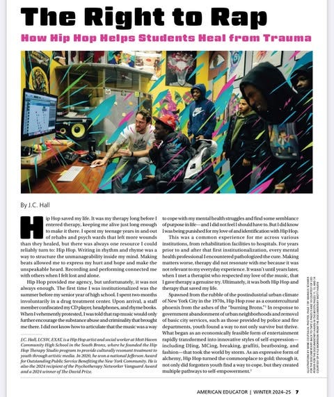 J.C.’s work was recently featured in American Educator, a quarterly journal published by the American Federation of Teachers. The publication also featured an article from one of J.C.’s former students Ephraim Weir, a poet and Hip Hop artist who recently passed.